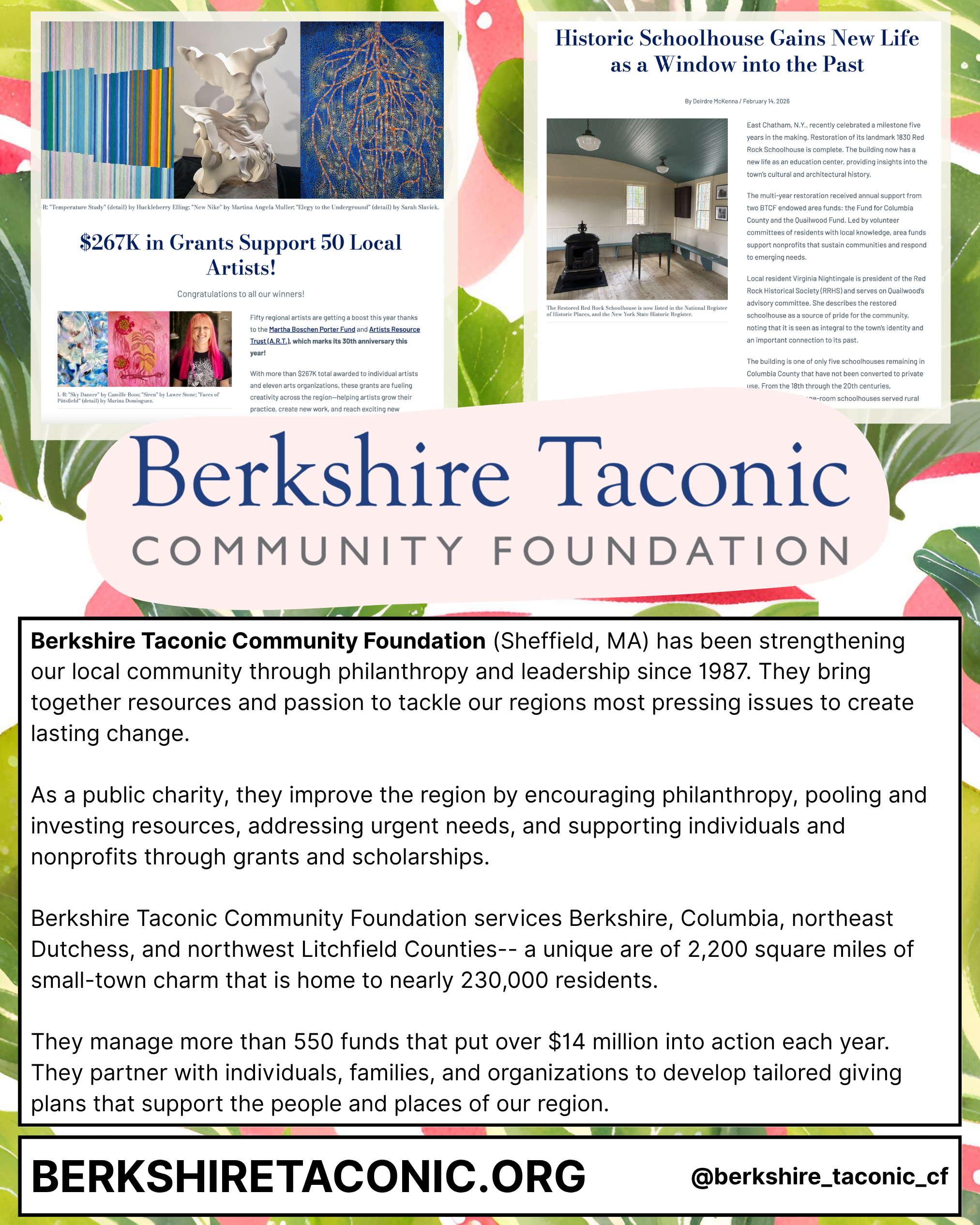 Throughout the season, you will see Berkshire Taconic and Olana in our community tent, in our weekly newsletter, and in our social media feed. We are beyond thankful for their support.